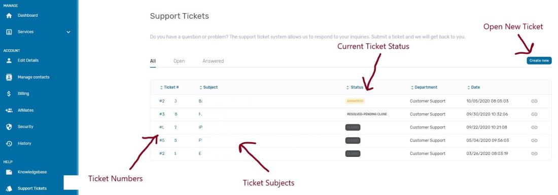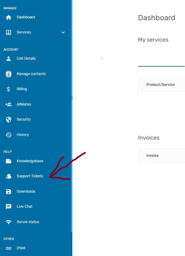 3. After logging in, you will be taken to the portal dashboard. Along the left side, a menu with different account management options will be shown. Depending on the services established on your account, the enter number of options and what specific options appear may differ slightly from the image below. However, all accounts will have a section titled "Help" with an option underneath it for "Support Tickets". Click on the Support Tickets link to go to a page that will allow you to review your ticket history and open a new ticket.